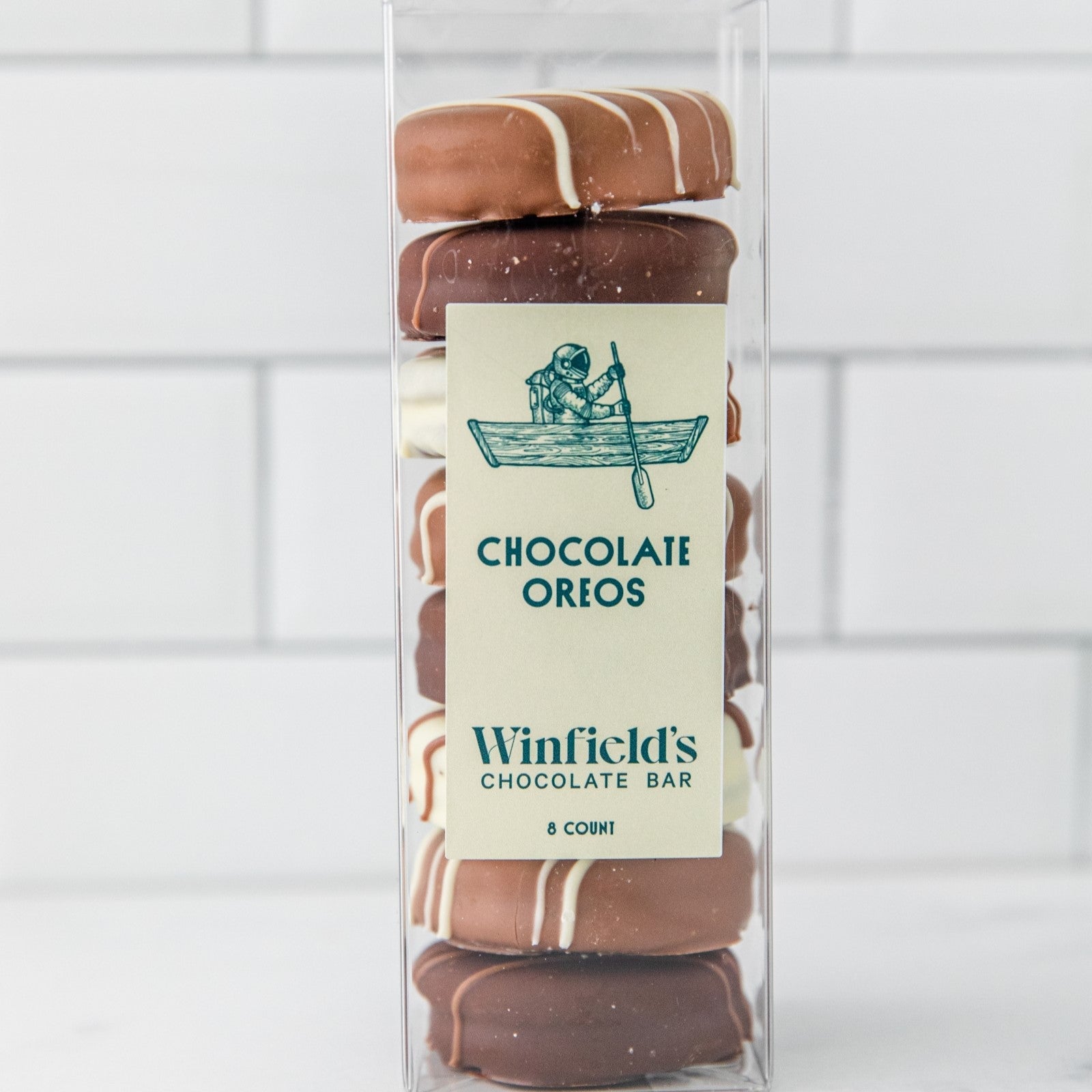 Double Stuffed Oreos smothered in premium chocolate, elegantly embellished with a chocolate ribbon drizzle and decorated for the season.